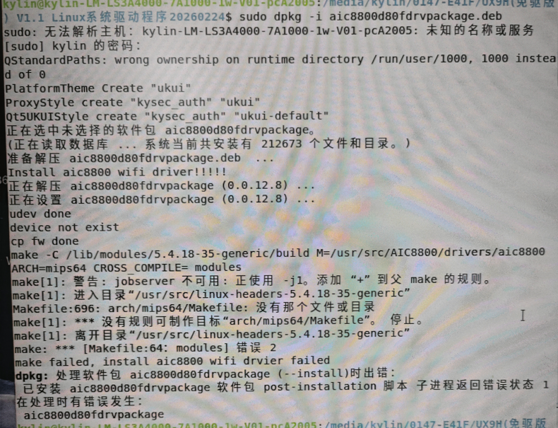 首先,驱动包的Makefile通过系统环境变量获取到处理器的架构是mips64,这没有问题,所以我们可以合理猜测,银河麒麟v10内核5.4.18版本的系统,不知道为什么实际上把mips64和mips合并到同一个目录了。所以我们只需要让驱动包Makefile找到正确的目录即可,你可以硬编码Makefile并手动编译。或者这里我用一种非常偷懒但有效且优雅的方式解决这个问题:ln -sfn mips/ mips64即直接创建一个链接目录到mips64即可,然后重新安装。