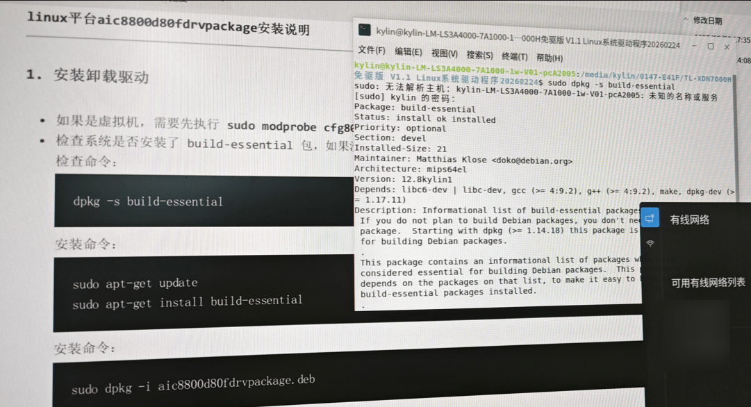众所周知国产系统有多种不同架构的处理器,如兆芯有x86,龙芯一般是mips,所以它的驱动为了兼容所有架构,它直接把源码放在了包里,安装的时候本质是自动本地编译驱动并安装。所以在安装说明文件里会要求安装 build-essential GCC编译套件。
