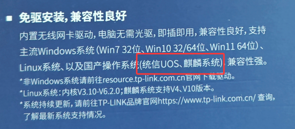 获取无线网卡驱动,通常购买的无线网卡包装会写支持 麒麟统信UOS 并告诉你在哪获取。